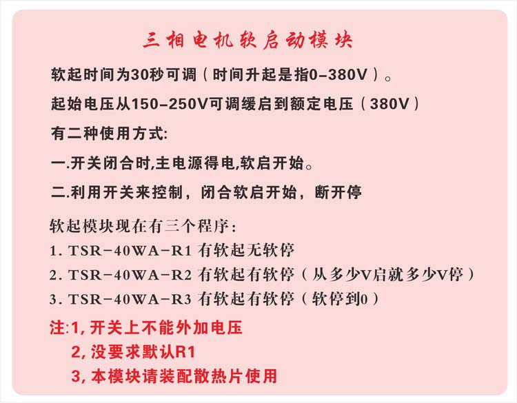 一. 三相電機(jī)軟起動(dòng)模塊特點(diǎn),全新產(chǎn)品,詳情請(qǐng)來(lái)電13636400688 ?、?不用信號(hào),可直接軟起,軟起時(shí)間(0-30秒)可預(yù)設(shè).起始電壓(150-250V)可預(yù)設(shè) ?、?可控硅輸出,可用于三相星形三角形接法 ?、?使用時(shí)需配適當(dāng)散熱器,必要時(shí)加強(qiáng)迫風(fēng)冷. ?、?本產(chǎn)品是將晶閘管主電路和移相觸發(fā)控制電路封裝在一起的多功能功率集成模塊 ?、?阻燃工程塑料外殼,銅底板,高溫焊接,瞬間承受過(guò)載能力強(qiáng) ?、?主要用途風(fēng)機(jī)調(diào)速,力矩電機(jī)調(diào)速,普通電機(jī)軟起動(dòng)等 二. 三相電機(jī)軟起動(dòng)模塊產(chǎn)品概述 用途:水泵,風(fēng)機(jī),航車,自耦變壓器等及三相電機(jī)軟啟動(dòng),替代可調(diào)自耦變壓器,變頻器軟啟動(dòng)等,接線簡(jiǎn)單, 不用接旁路接觸器,經(jīng)濟(jì)實(shí)用,填補(bǔ)同類產(chǎn)品空白。