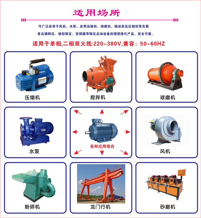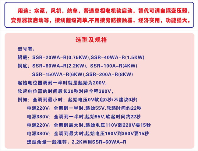 用途:水泵,風機,航車,自耦變壓器等及普通單相電機軟啟動,替代可調(diào)自耦變壓器,變頻器軟啟動等,接線簡單, 不用接旁路接觸器,經(jīng)濟實用,填補同類產(chǎn)品空白。