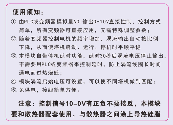 塔機回轉(zhuǎn)渦流模塊(塔機回轉(zhuǎn)渦流控制器)是提供可調(diào)節(jié)電壓的一種裝裝置。渦流模塊由PLC控制配合不同信號分別輸出不同大小的直流電壓,達(dá)到回壓回轉(zhuǎn)速度,完好地解決了:塔機在運轉(zhuǎn)速度、塔機再運轉(zhuǎn)難、啟動時間長、回轉(zhuǎn)停車時塔機晃動較大、工作一段時間后回轉(zhuǎn)電機發(fā)熱嚴(yán)重的難題。